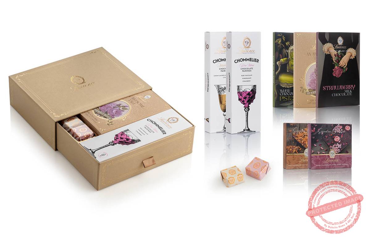 “Chommelier” для білого вина (начинка - білий шоколад зі смаком лимона і шматочками цитрона) і для рожевого вина (начинка - ягідний шоколад із гранатом і полуничними цукатами)