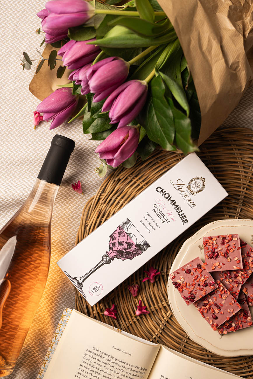 “Chommelier” для білого вина (начинка – білий шоколад зі смаком лимона і шматочками цитрона) і для рожевого вина (начинка – ягідний шоколад із гранатом і полуничними цукатами)
