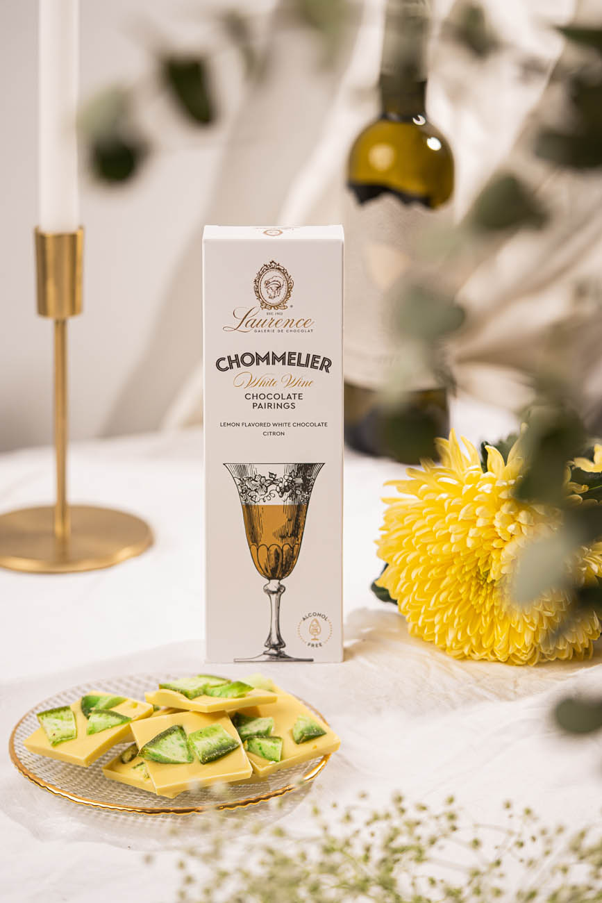 “Chommelier” для білого вина (начинка – білий шоколад зі смаком лимона і шматочками цитрона) і для рожевого вина (начинка – ягідний шоколад із гранатом і полуничними цукатами)